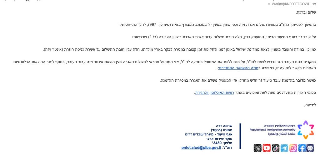 בהזמנת עובד מחו”ל תשלום האגרה ע”ח המטופל.